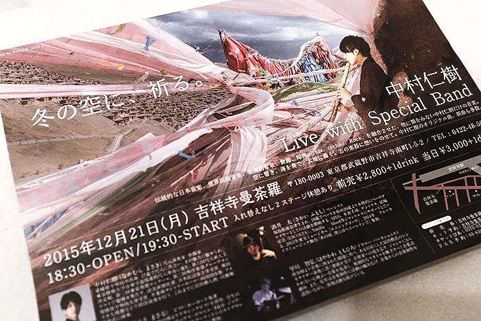尺八奏者の中村仁樹氏のライブ「中村仁樹 Live with Special Band」のフライヤーに、私が撮影したチベットの写真が掲載された。